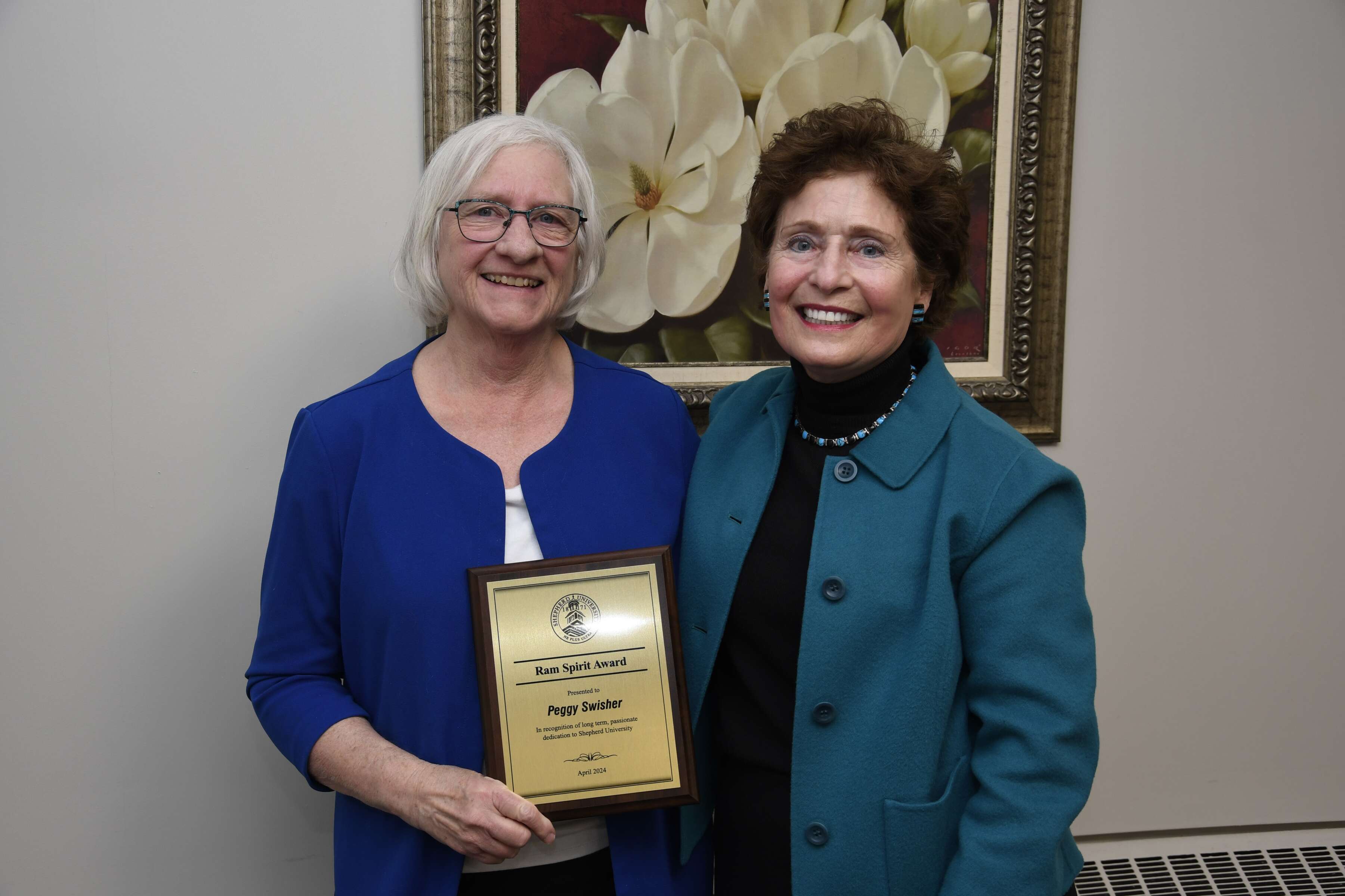 The Ram Spirit Award is for a staff member who exemplifies long-term, passionate dedication to Shepherd University, and who has been a University employee for at least five years. The 2024 Ram Spirit Award was presented to Peggy Swisher.