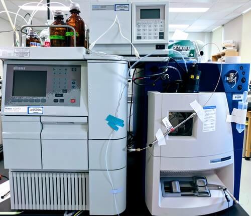 Waters 2680 Separations Module with autosampler, UV detector, and Micromass triple quadrupole mass spectrometer. Dr. Cole was awarded a WV EPSCoR grant to help purchase this instrument and uses it for her research.