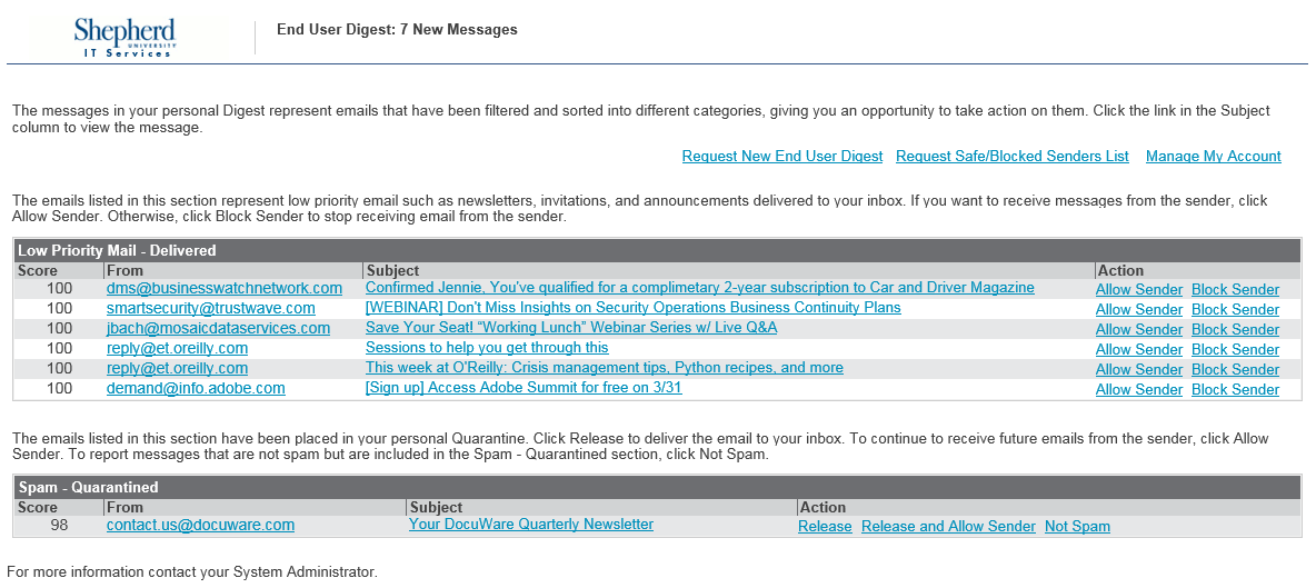 If email messages addressed to you are sent to the End User Digest, you will receive an email notification periodically in your inbox. The Digest provides you with a list of the messages addressed to you that are Low Priority and have been delivered or Spam messages that are stored in the Quarantine. You can see the email addresses, the message subject, and the security score.