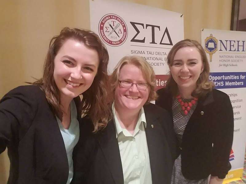 On March 30th, English majors Julia Athey and Brianna Maguire attended the Sigma Tau Delta International Convention in Louisville, Kentucky with Dr. Hanrahan. Julia presented a paper on Wuthering Heights, and Dr. Hanrahan moderated another session on Victorian women writers.