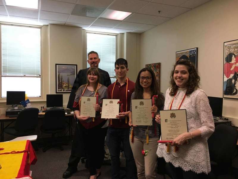 On Wednesday, April 12th, Dr. Denis Berenschot and Dr. Eva-María Suárez Büdenbender inducted four Spanish majors into Shepherd University’s chapter of Sigma Delta Pi (ΣΔΠ), the national collegiate Hispanic honor society. The spring 2017 inductees include Holly Fridley, Keira Cale, Shirley Haimes, and Neal Crosson. The ceremony is celebrated annually, and eligible students are selected for membership by the faculty.