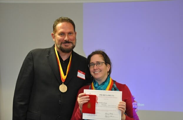 On Tuesday, April 2nd, the honor society for international scholars, Phi Beta Delta (ΦΒΔ)—specifically Shepherd University’s Theta Epsilon chapter—held its annual induction ceremony. One of our own, Dr. Rachel Krantz, was inducted, as was our Dean, Mr. Dow Benedict.