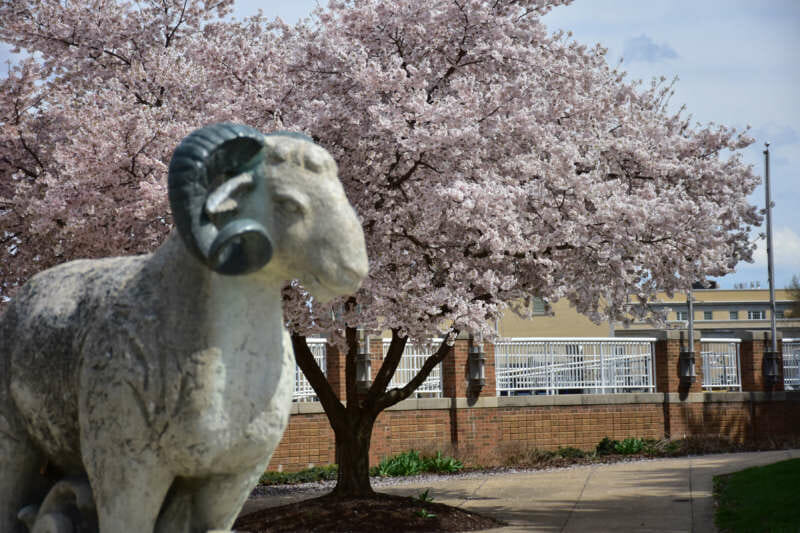 Spring flowers behind the Ram Statue.