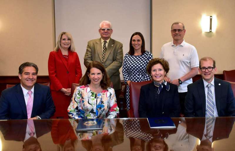 Those participating in the pharmacy articulation agreement are (front row, l. to r.) Dr. Robert DiCenzo, dean, Bernard J. Dunn School of Pharmacy; Dr. Tracy Fitzsimmons, president, Shenandoah University; President Mary J.C. Hendrix; and Dr. Scott Beard, acting provost; back row, Dr. Gina Peacock, assistant dean, Bernard J. Dunn School of Pharmacy; Dr. Robert Warburton, acting dean, College of Natural Sciences and Mathematics; Dr. Katie Sanders, director of admissions, Bernard J. Dunn School of Pharmacy; and Dr. Dan DiLella, chair, Department of Chemistry.
