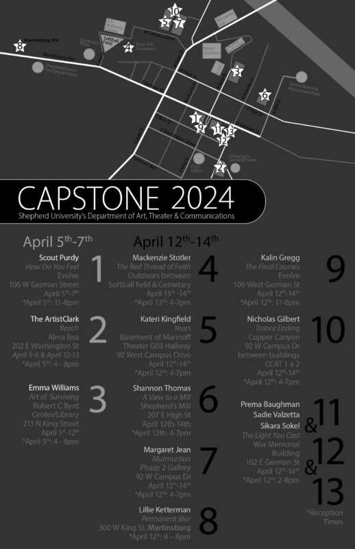 SHEPHERDSTOWN, WV — As the academic year closes, Shepherd University’s graduating studio art majors must exhibit a collection of their work in a professional gallery or setting. Students must organize the event—from finding a space to hold the exhibit, to promoting it, creating a catalogue of the works shown, setting it up, and taking it down.