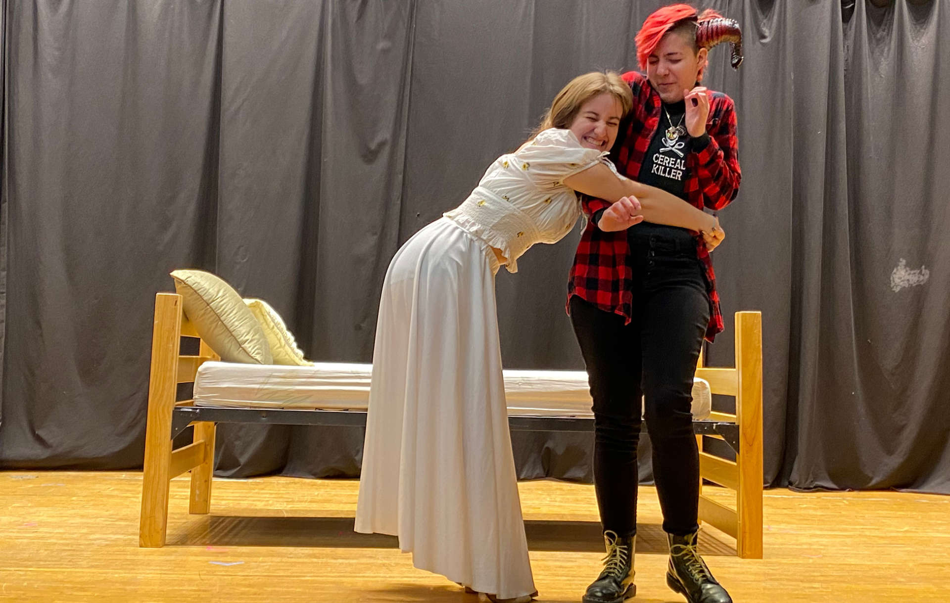 Dannah Lohr (left), an English major from Bunker Hill, West Virginia, and Aero Santaella, a secondary education major from Clear Spring, Maryland, rehearse “To Start a Flame.”