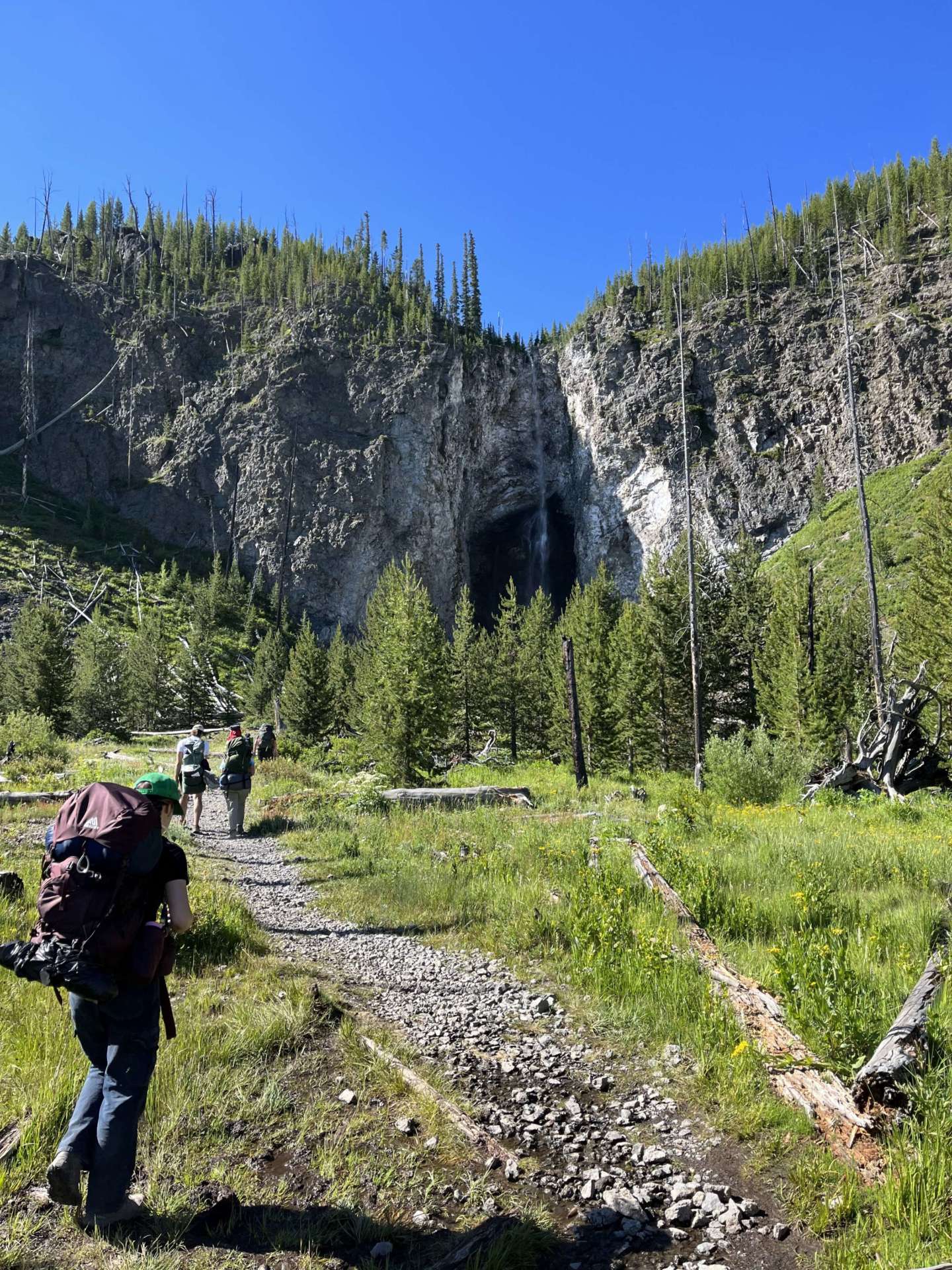 The following day would be our last full day in Yellowstone, and we aimed to spend it in the backcountry. After breaking camp, packing our backpacks, and watching an informational video about backcountry safety and etiquette at the ranger station, we set off for the Freight Road Trailhead, not far from where Thomas Brock made his microbial discovery. The gray sky hinted at showers, which began shortly after we started our hike. We paused to put on rain gear and continued to our destination in Imperial Meadows. A few hours later, the showers had subsided, replaced by blue skies and strong wind that made setting up camp a challenge. From our campsite, we could see the windswept gossamer veil of Fairy Falls to the southwest. The winds calmed by late afternoon, only to be replaced by biting flies. As the sun set, a bald eagle took a rest in a nearby tree, and we got some rest from the flies as they changed shifts with the mosquitos. Dowsed in insect repellent, we communed by the campfire, some of us lingering well after dark to gaze at the stars in the moonless sky, far removed from civilization.