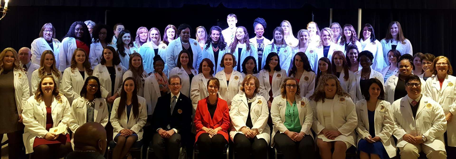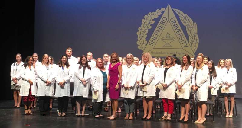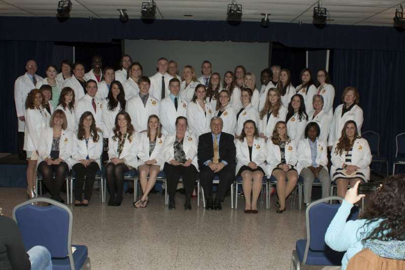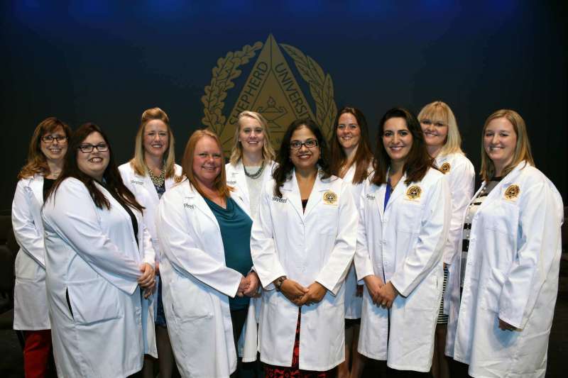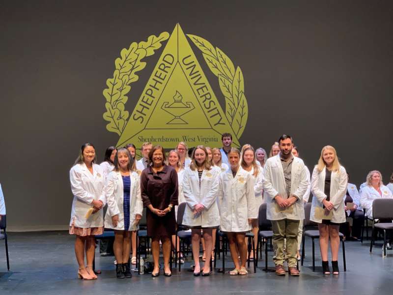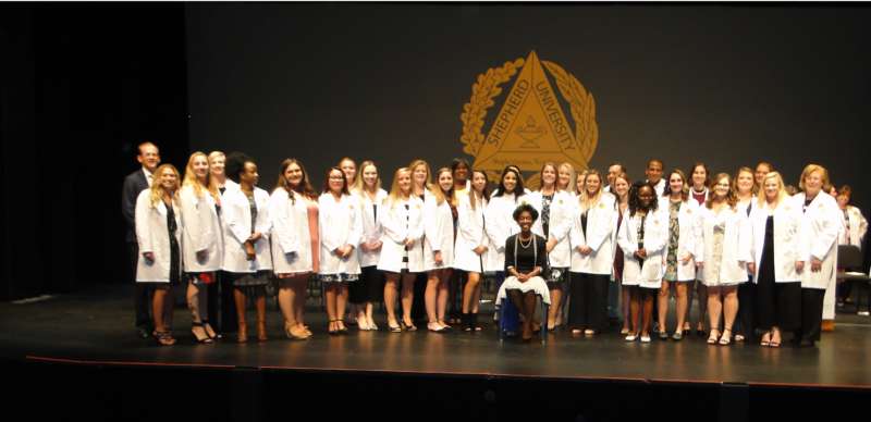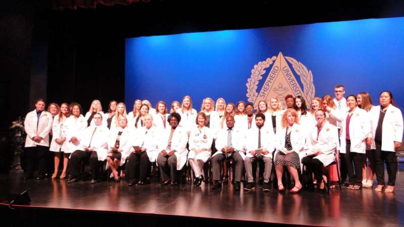 On October 3, 2014, Shepherd University’s Department of Nursing Education took part in it’s first White Coat Ceremony. Shepherd University is one of 100 schools across the country, and the only school in West Virginia, chosen to take part in this new initiative. The White Coat Ceremony was designed by The Arnold P. Gold Foundation for physicians and surgeons as a rite of passage at medical schools. The Gold Foundations is teaming with the American Association of Colleges of Nursing to make the White Coat Ceremony a tradition for nursing students as well. Each semester Shepherd’s new nursing students will participate in this initiative where the students will recite an oath, be cloaked in a white coat, and will receive a pin.