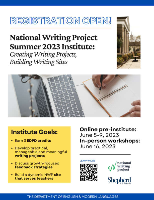 Shepherd University’s National Writing Project site launched its inaugural Summer Institute on June 16, 2023 with an event titled “Creating Writing Projects, Building Writing Sites.” This workshop brought together local teachers and Shepherd’s writing faculty to collaborate on innovative ways to improve writing instruction and promote a culture of writing across the curriculum in our region. Teachers from Berkeley and Jefferson counties participated in workshops and interactive sessions, focusing on project-based learning and effective writing practices. The workshop displayed the Department of English and Modern Languages’ commitment to supporting local educators and enhancing regional writing instruction. Dr. Brian Santana, Visiting Assistant Professor of English, and Dr. Heidi Hanrahan, Professor of English, organized the event with the generous financial support of the President’s Fund. Dr. Valerie Stevens, Lecturer of English; Mr. Christopher Wilson, Lecturer of English; and Ms. Sadie Shorr-Parks, Lecturer of English, taught sessions at the workshop. Shepherd’s National Writing Project initiative recently received over $600,000 in Congressionally Directed Spending funds to support extensive in-state projects over the next two and a half years.