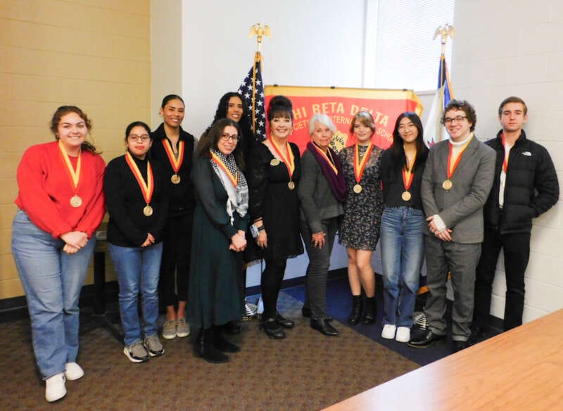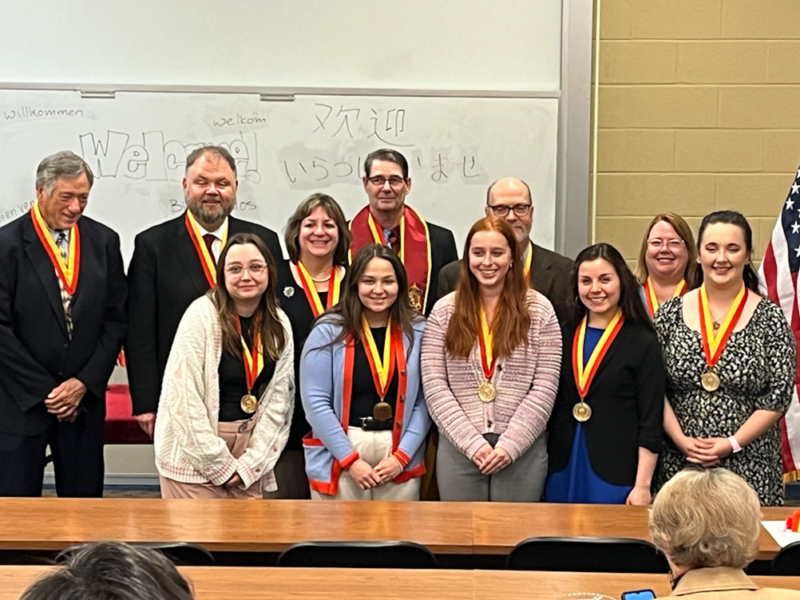 Pictured (front row) are Brianna Martin, Cheyenne Hooker, Elizabeth Cook, Paola C. Torres, and Kristina Kandalis. Back row, Richard Anson, John Unger, Dr. Heidi Dobish, Phi Beta Delta chapter president, Dr. Aart Holtslag, Dr. Keith Alexander, and Dr. Tracy Nichols. (Photo credit Barbara Kandalis)