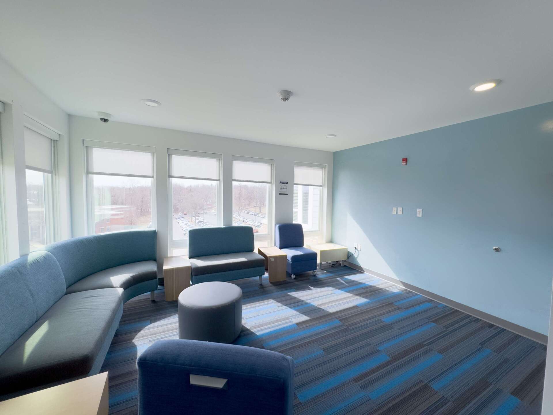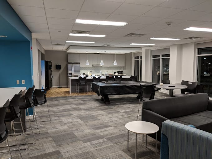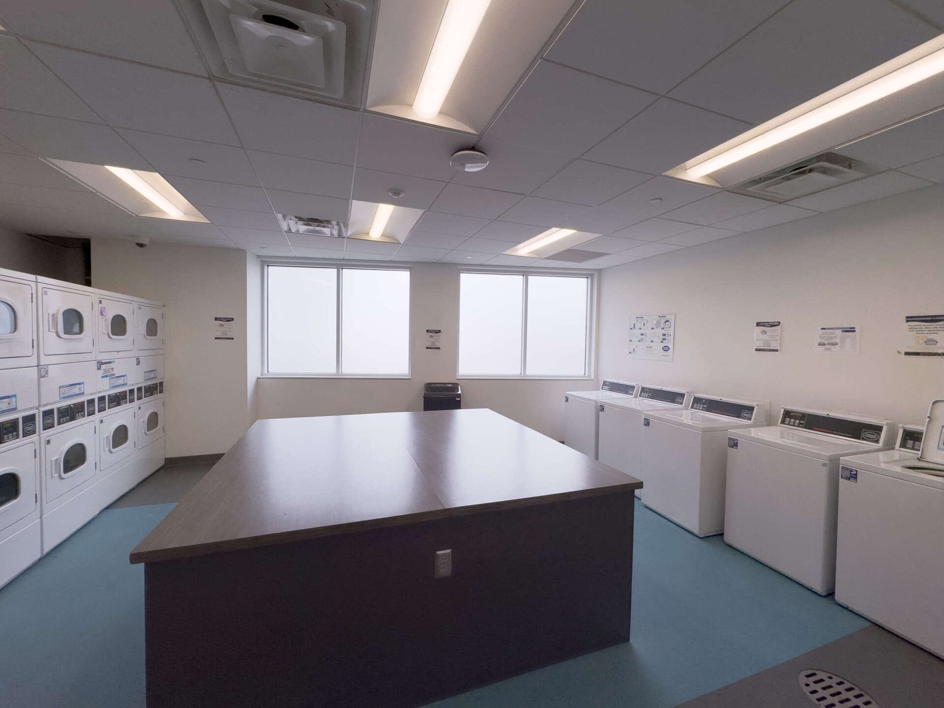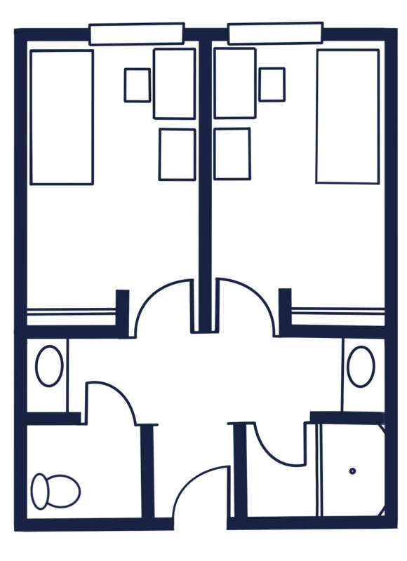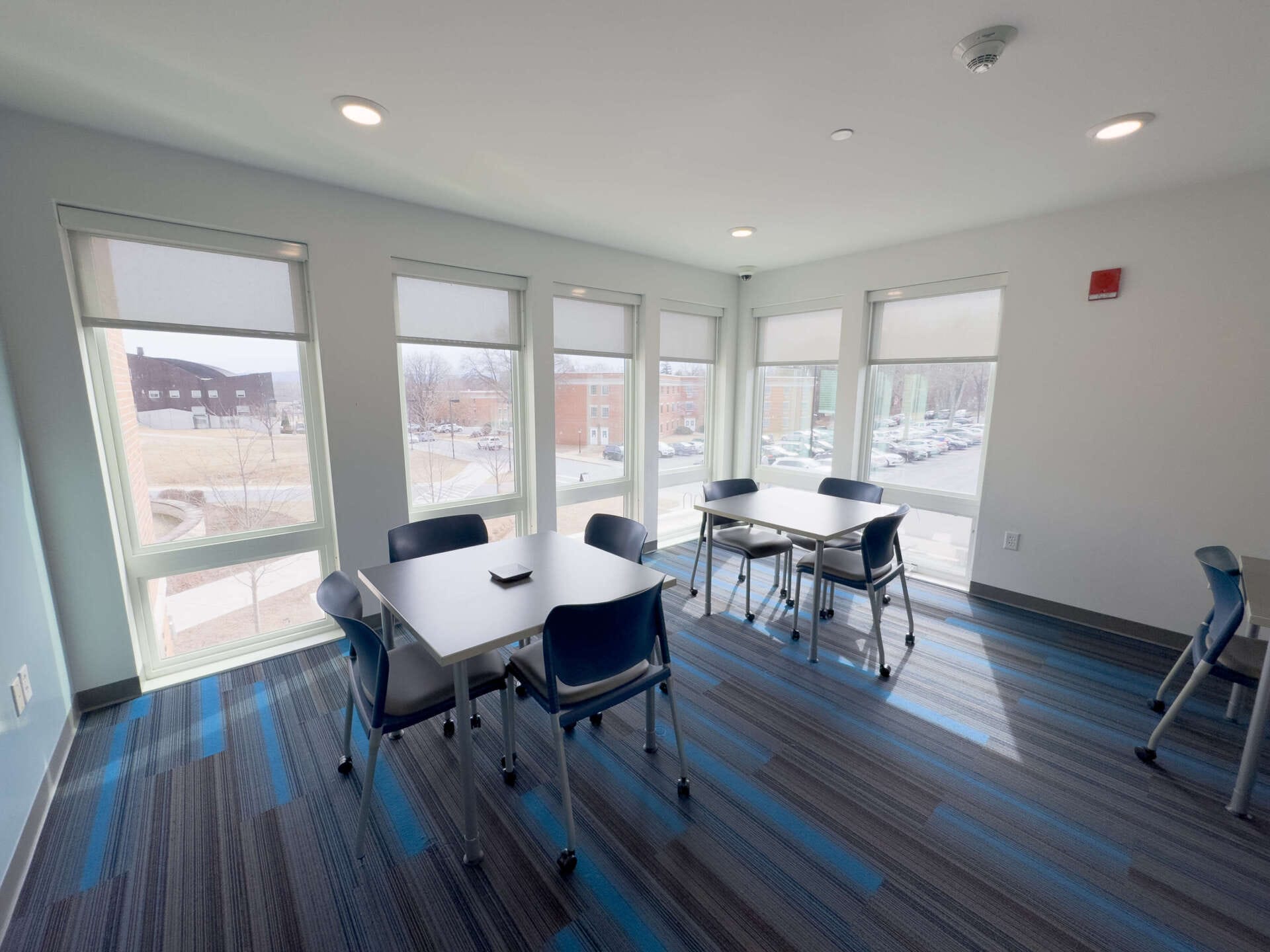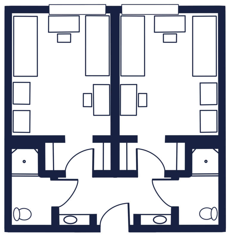 Potomac Place is a suite-style residence hall that offers double and single-occupancy rooms with semi-private bathrooms for each suite (no more than two residents will share a bathroom). Most students are assigned to double-occupancy rooms with two bedrooms, two bathrooms, and a shared foyer area. Limited single-occupancy rooms are available for an additional fee and are prioritized for residents with ADA housing accommodations. Single-occupancy rooms contain two bedrooms, one bathroom, and a shared foyer. Study rooms and lounges are accessible 24/7 on each floor. The first floor features a community kitchen, pool table, vending machines, and free laundry facilities.