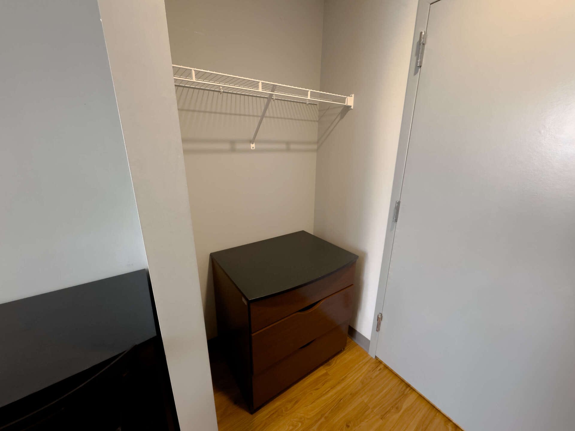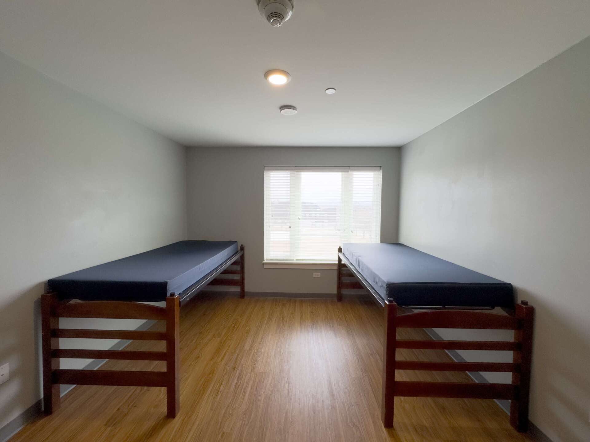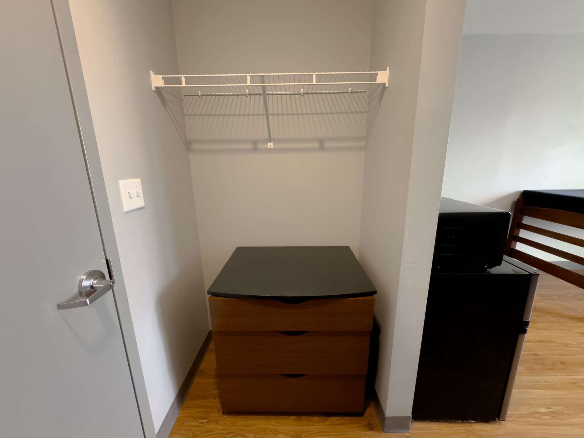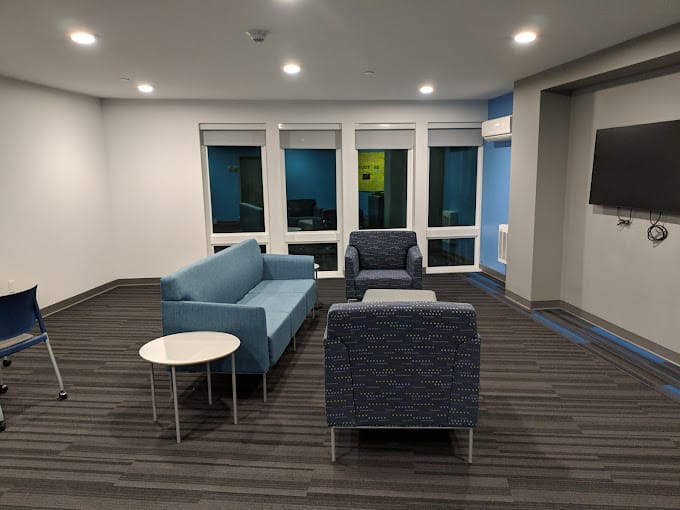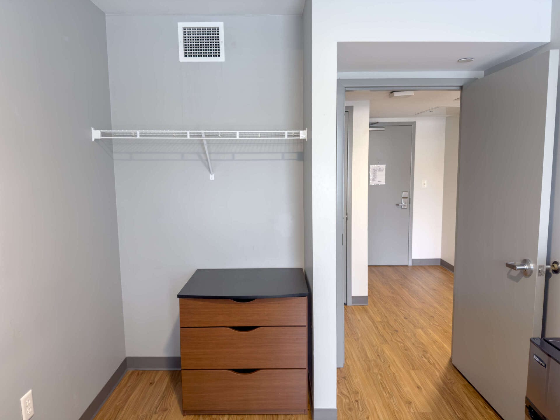 Potomac Place is a suite-style residence hall that offers double and single-occupancy rooms with semi-private bathrooms for each suite (no more than two residents will share a bathroom). Most students are assigned to double-occupancy rooms with two bedrooms, two bathrooms, and a shared foyer area. Limited single-occupancy rooms are available for an additional fee and are prioritized for residents with ADA housing accommodations. Single-occupancy rooms contain two bedrooms, one bathroom, and a shared foyer. Study rooms and lounges are accessible 24/7 on each floor. The first floor features a community kitchen, pool table, vending machines, and free laundry facilities.