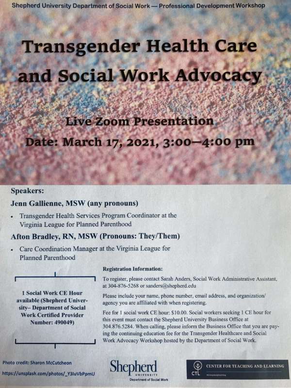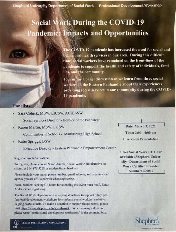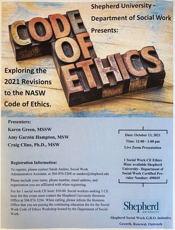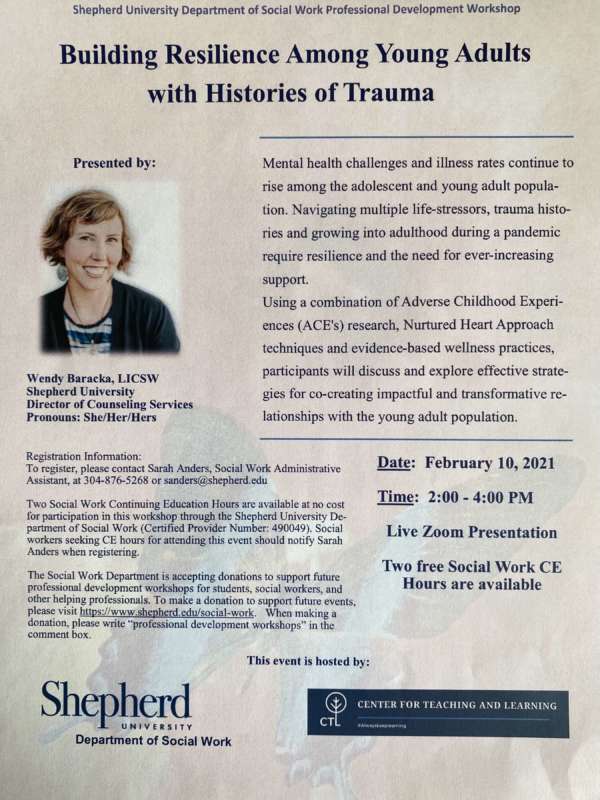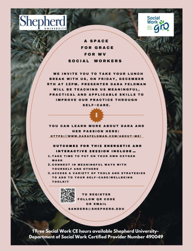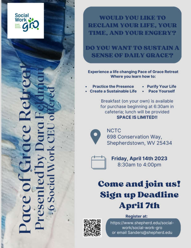 The mission of the Social Work G.R.O. Initiative (Growth, Renewal, Outreach), in concert with the mission of the Shepherd University Social Work Program, is to expand opportunities for professional development, self-care, and networking to social workers and other helping professionals in our community while providing opportunities for social work student / social work practitioner interaction in shared learning environments.