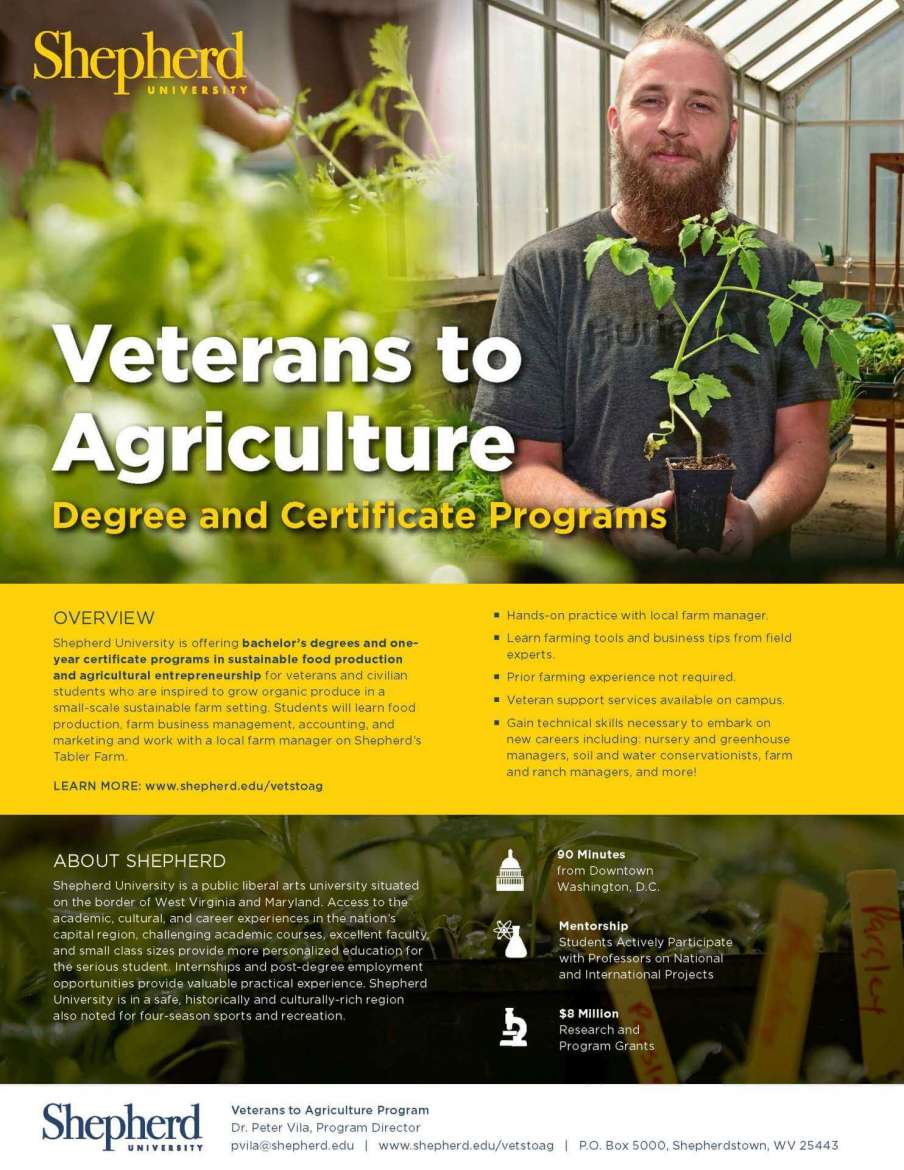 The Veterans to Agriculture Program is a hands-on, one-year certificate program that offers student veterans with the skill set needed to manage or launch a successful sustainable agriculture production enterprise.